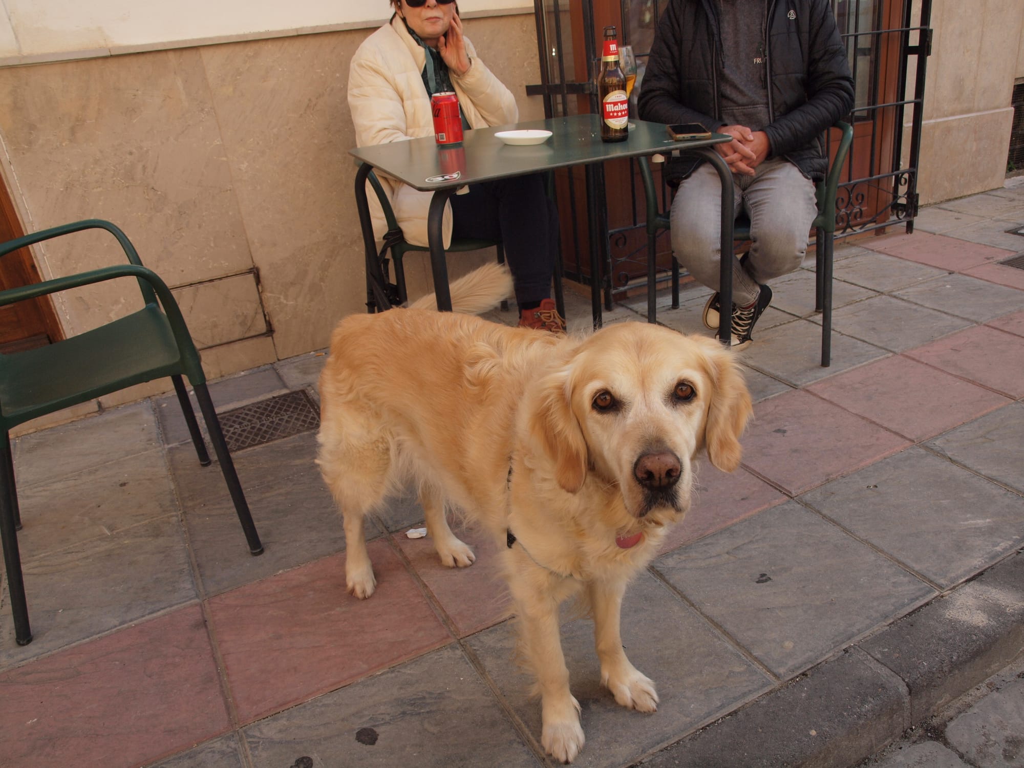 Later, yo hice senderismo with Camilla and Robby near a town called Vélez Blanco. The hike was pretty mild, but more than anything it was rejuvenating to get outside and walk around for a bit. I chatted with a few Spaniards during lunch and they gave me lots of recommendations of foods to try at Mercadona. There are some old cave paintings with this jester kinda guy on the wall; he is a pretty common symbol to see all around town. I left the group for a spell and got a beer in town, where I met a lovely charming retriever (see below).